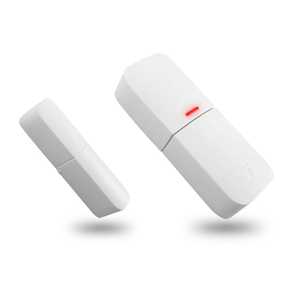 Kontaktron czyli czujnik otwarcia drzwi / okna. Składa się z dwóch części - magnesu i nadajnika. Jedną część należy zamontować na skrzydle drzwi lub okna, a drugą w pobliżu - na ramie lub ścianie. W chwili kiedy części oddalą się od siebie do centrali zostanie wysłane powiadomienie o naruszeniu przestrzeni, co wywoła alarm.