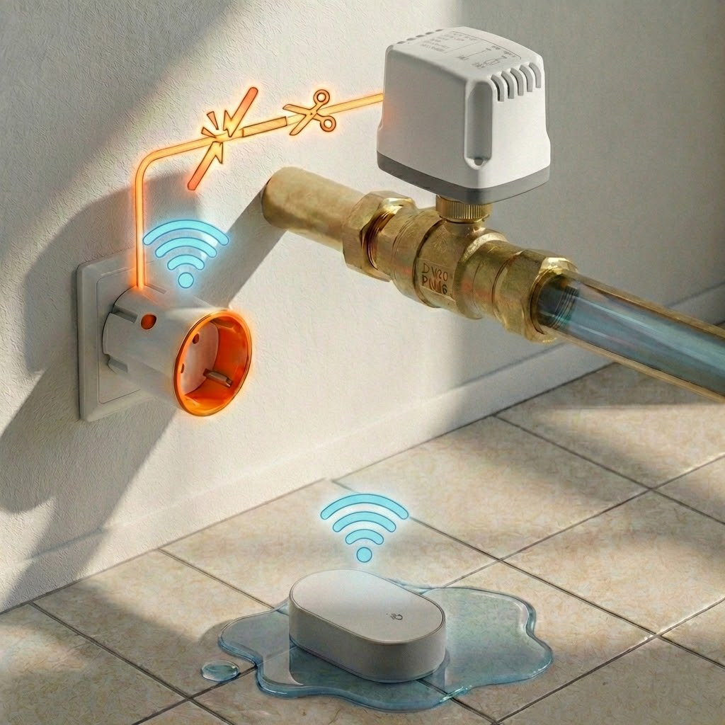 ➡️Przykładowo: podłącz elektrozawór do inteligentnego gniazdka i skonfiguruj prostą scenę z czujnikiem zalania. W momencie wykrycia wycieku czujnik aktywuje gniazdko, a ono wyłączy zawór, który natychmiast odetnie dopływ wody.