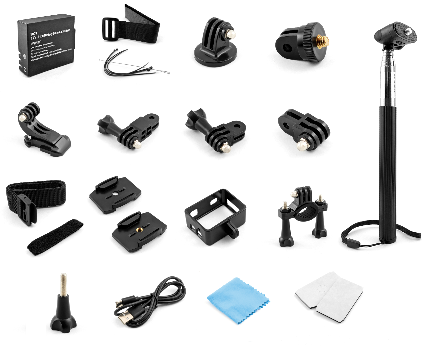 Do kamery dołączamy niezwykle bogaty zestaw akcesoriów, a uniwersalny system ich montażu gwarantuje zgodność z akcesoriami innych producentów jak np. GoPro czy SJCAM