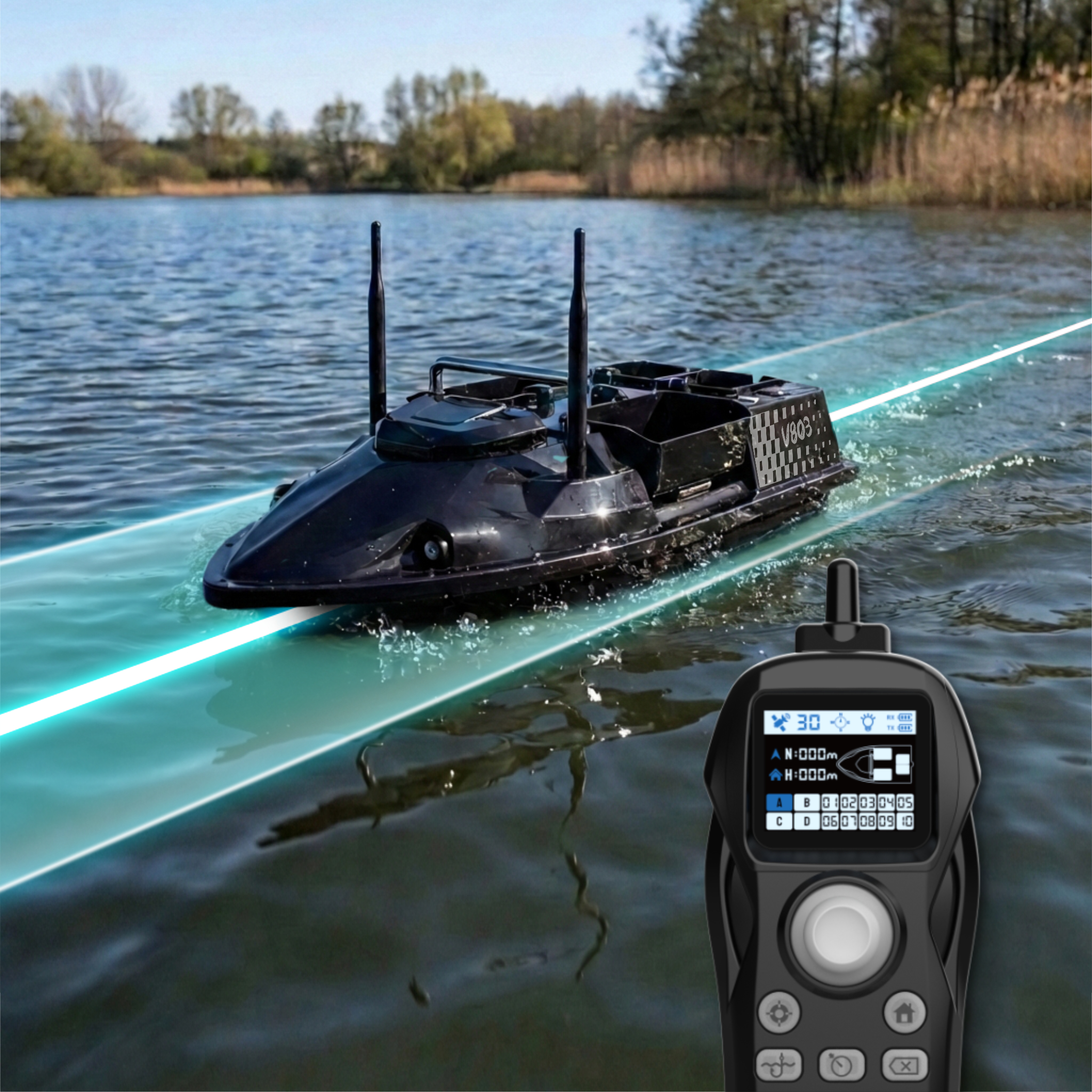 Łodź zanętowa GOMEDIA V803 GPS została wyposażona w system elektronicznej kotwicy - po jego aktywacji łódka będzie utrzymywała ustaloną pozycję przeciwstawiając się się wiatrowi, prądom, falom itd.