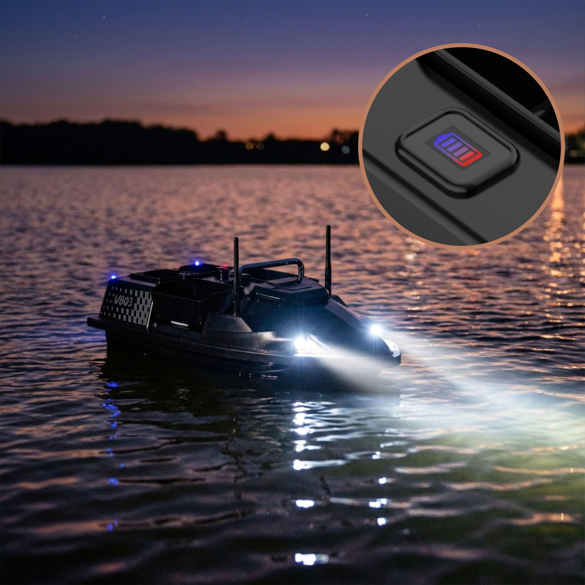 Łódka GOMEDIA V803 GPS jest wyposażona w silne białe światła frontowe - oświetlające drogę przed łodzią. Oraz tytlne światła kierunkowe - wskazujące stronę w którą łódź skręca.