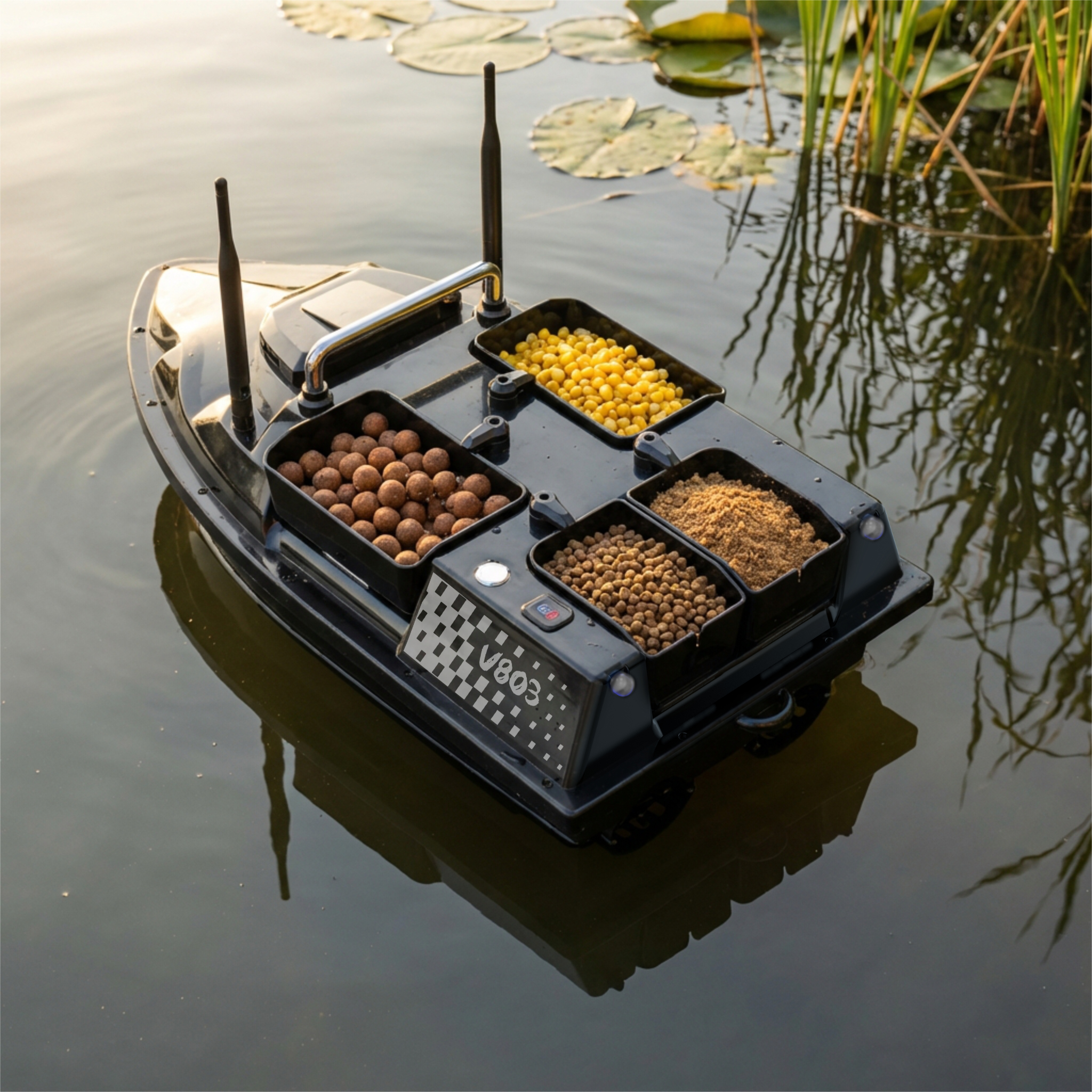 GOMEDIA V803 GPS posiada cztery podajniki na zanętę, każda z wyrzutni może być kontrolowana osobno.
