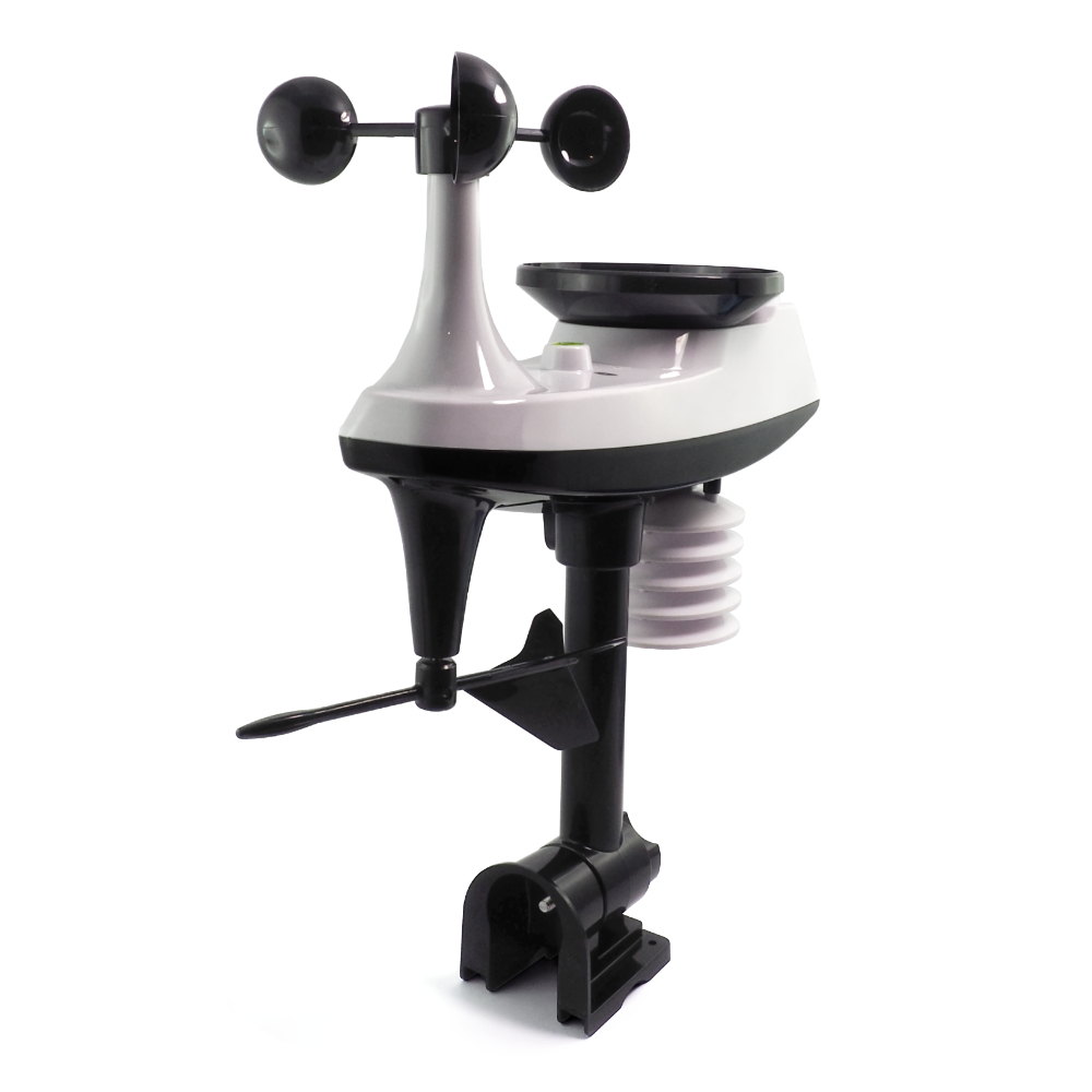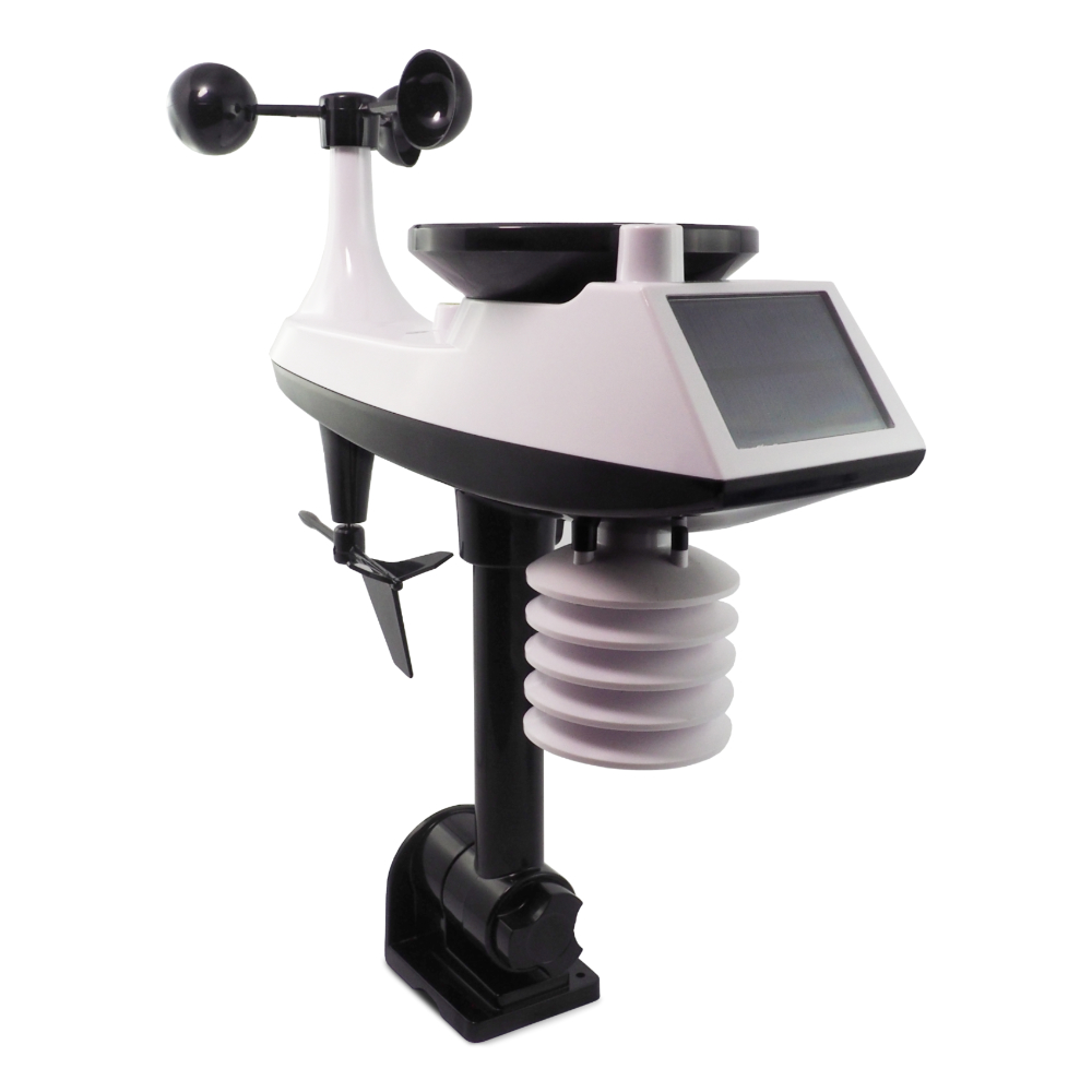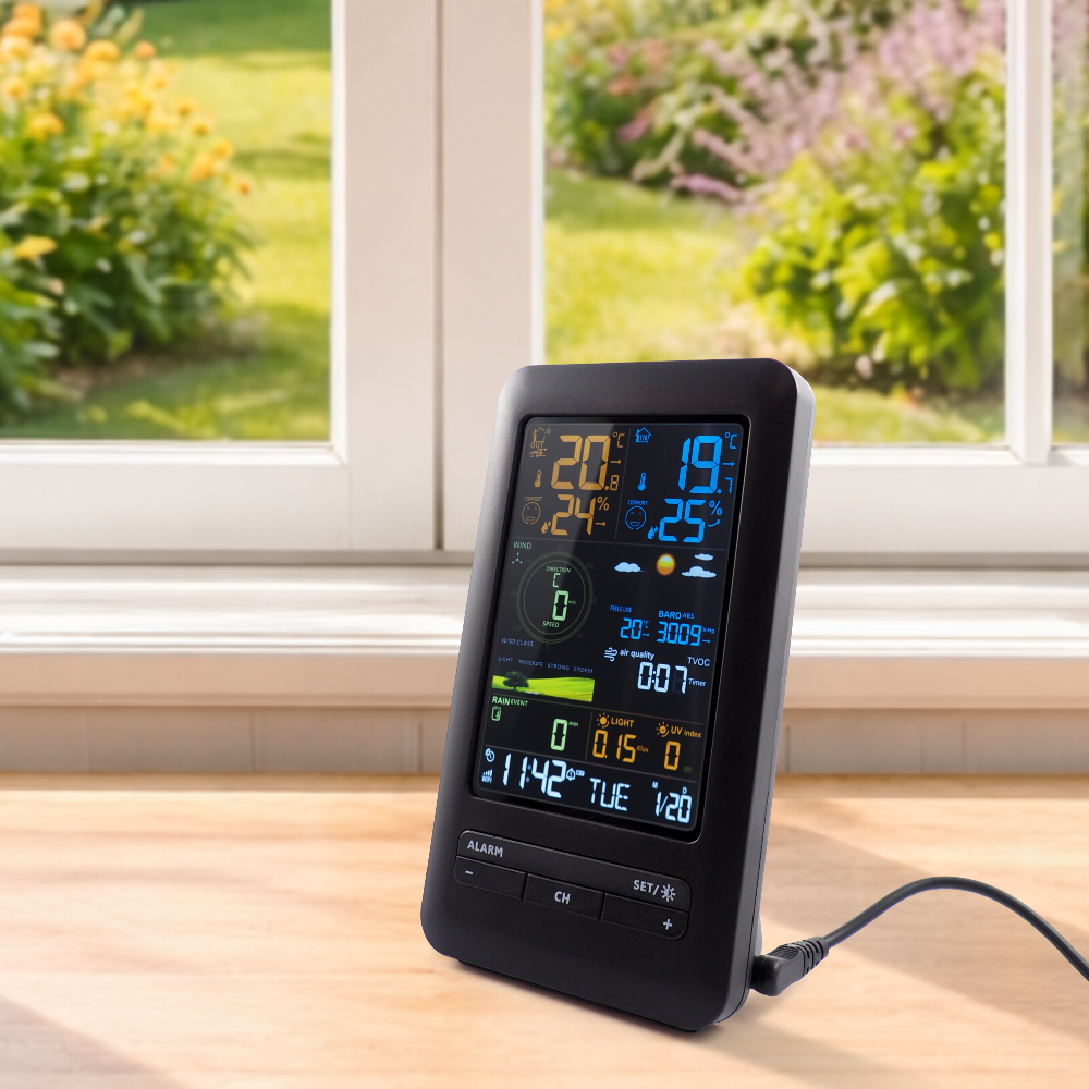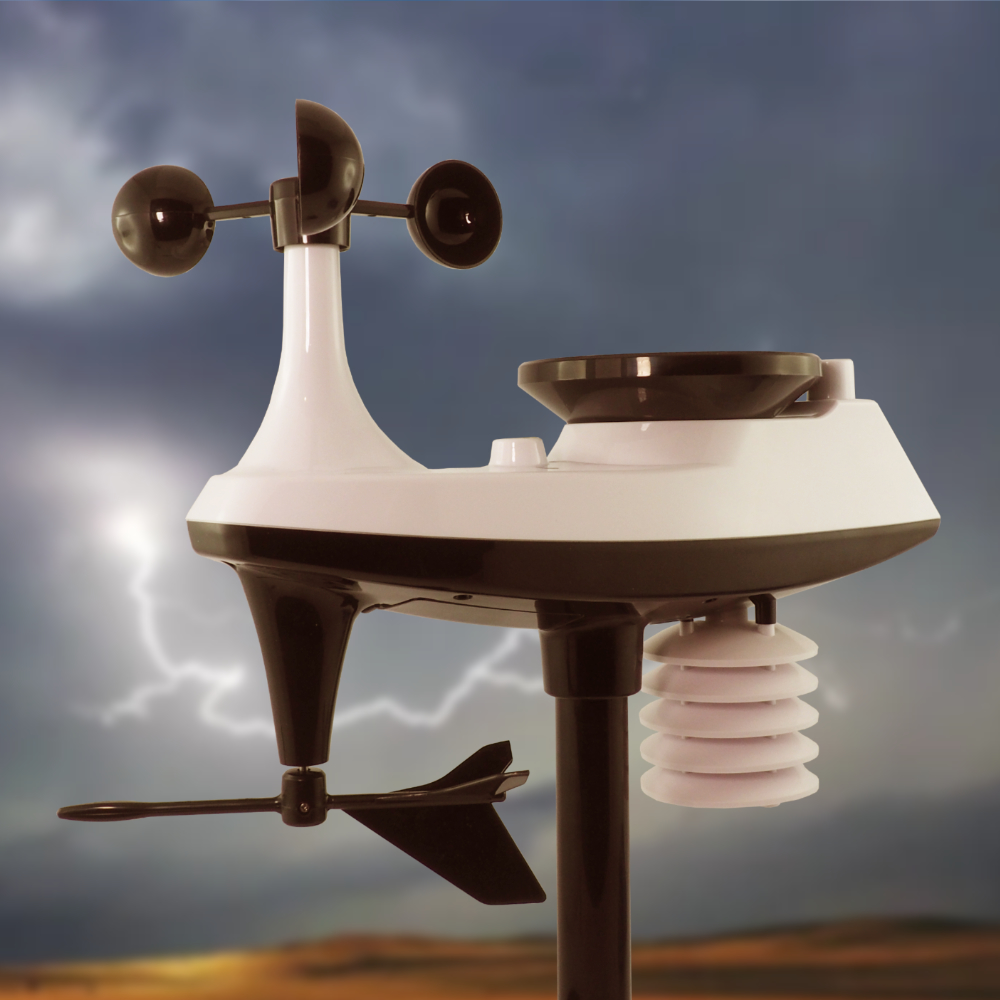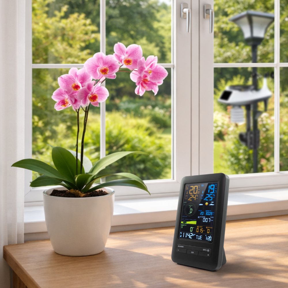 Stacja pogodowa dostarcza dokładne dane o warunkach atmosferycznych na zewnątrz, w tym o opadach i wietrze.