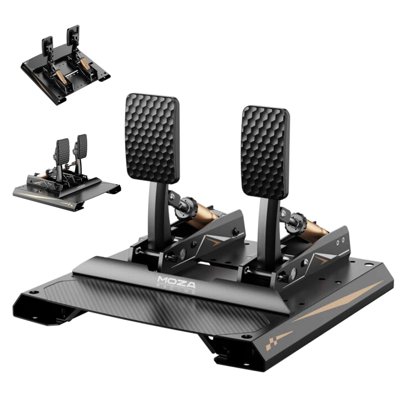 Zestaw pedałów Moza Racing CRP2 RS066 łączy nowoczesny design z wysoką funkcjonalnością. Elegancka czarno-złota kolorystyka oraz sprytnie ukryte elementy mechaniczne, takie jak sprężyny, śruby i okablowanie, gwarantują estetyczny, minimalistyczny wygląd. Sześciokątny wzór na pedałach oraz karbonowa płyta pod pięty dodają zadziorności i sportowego charakteru.