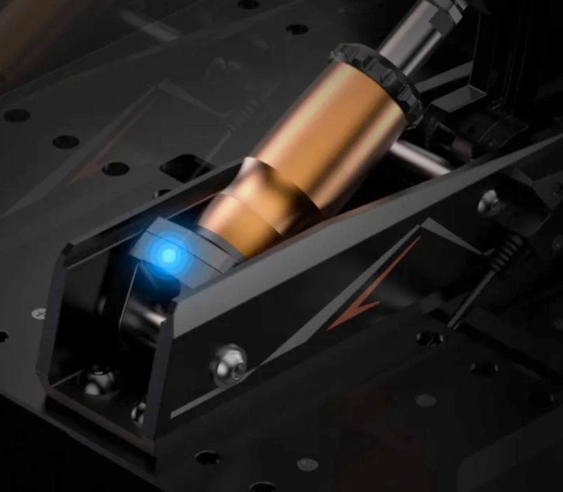 Mechanizmy hamulca i gazu poruszają się gładko i niemal bezgłośnie dzięki zastosowaniu zamkniętej konstrukcji oraz wałka ze stali wysokopolerowanej. Dodatkowa amortyzacja w punktach skrajnych zapewnia doskonałe tłumienie hałasu, co sprawia, że każda sesja wyścigowa jest komfortowa i cicha.